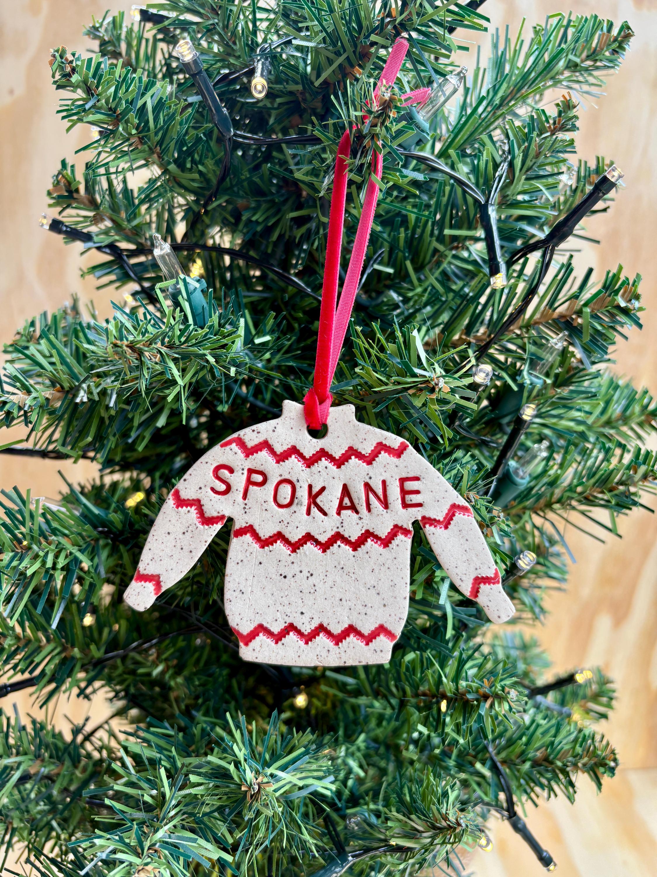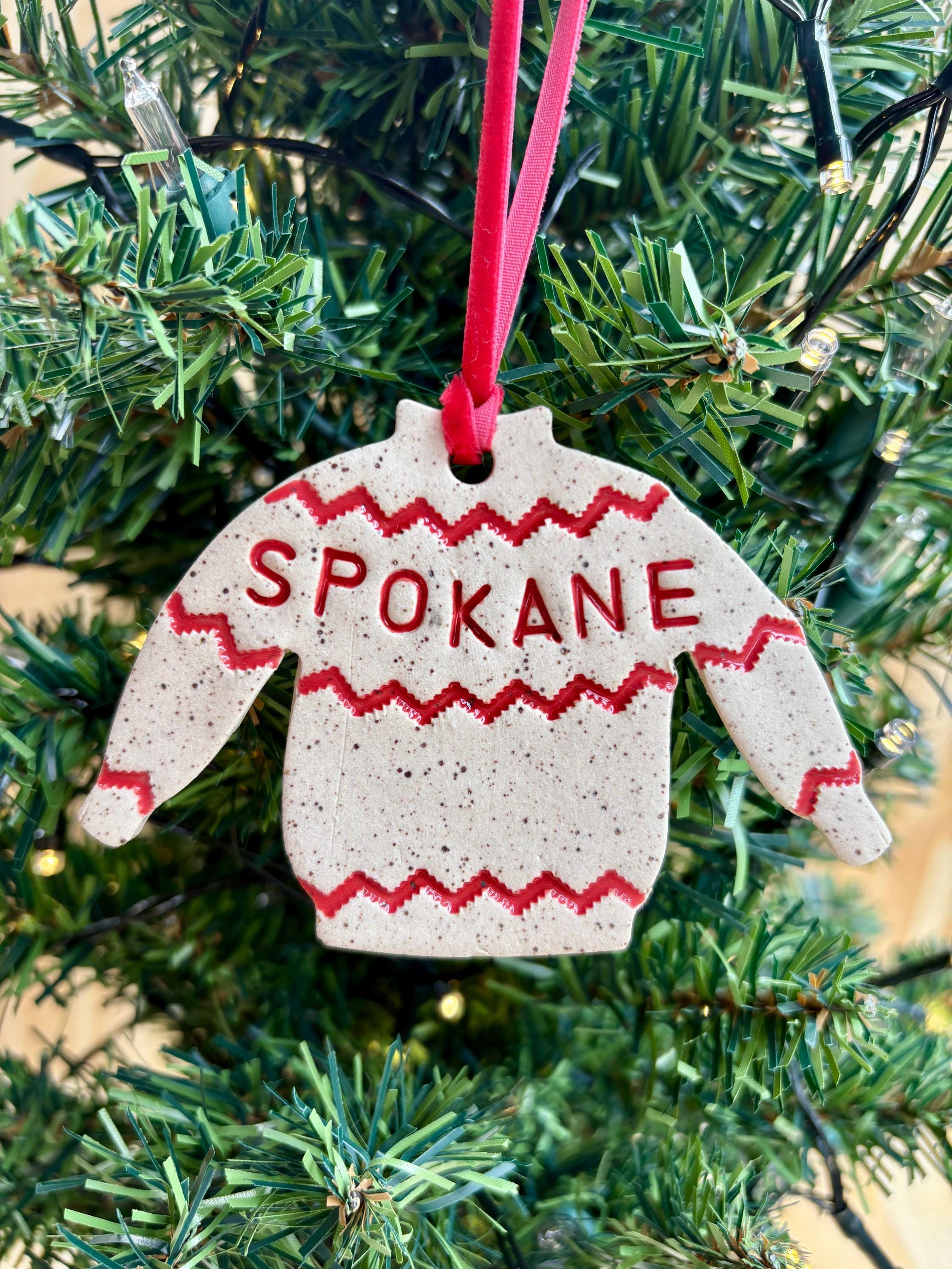 This adorable sweater ornament is made by hand with stoneware clay, stamped with SPOKANE, and finished with red glaze! The ornament includes a red velvet ribbon.