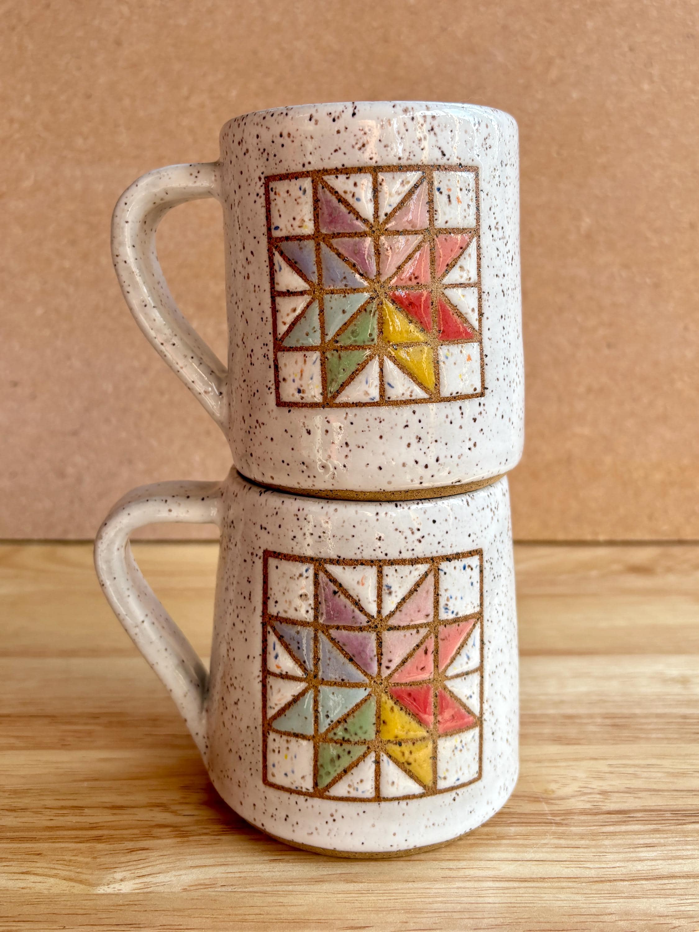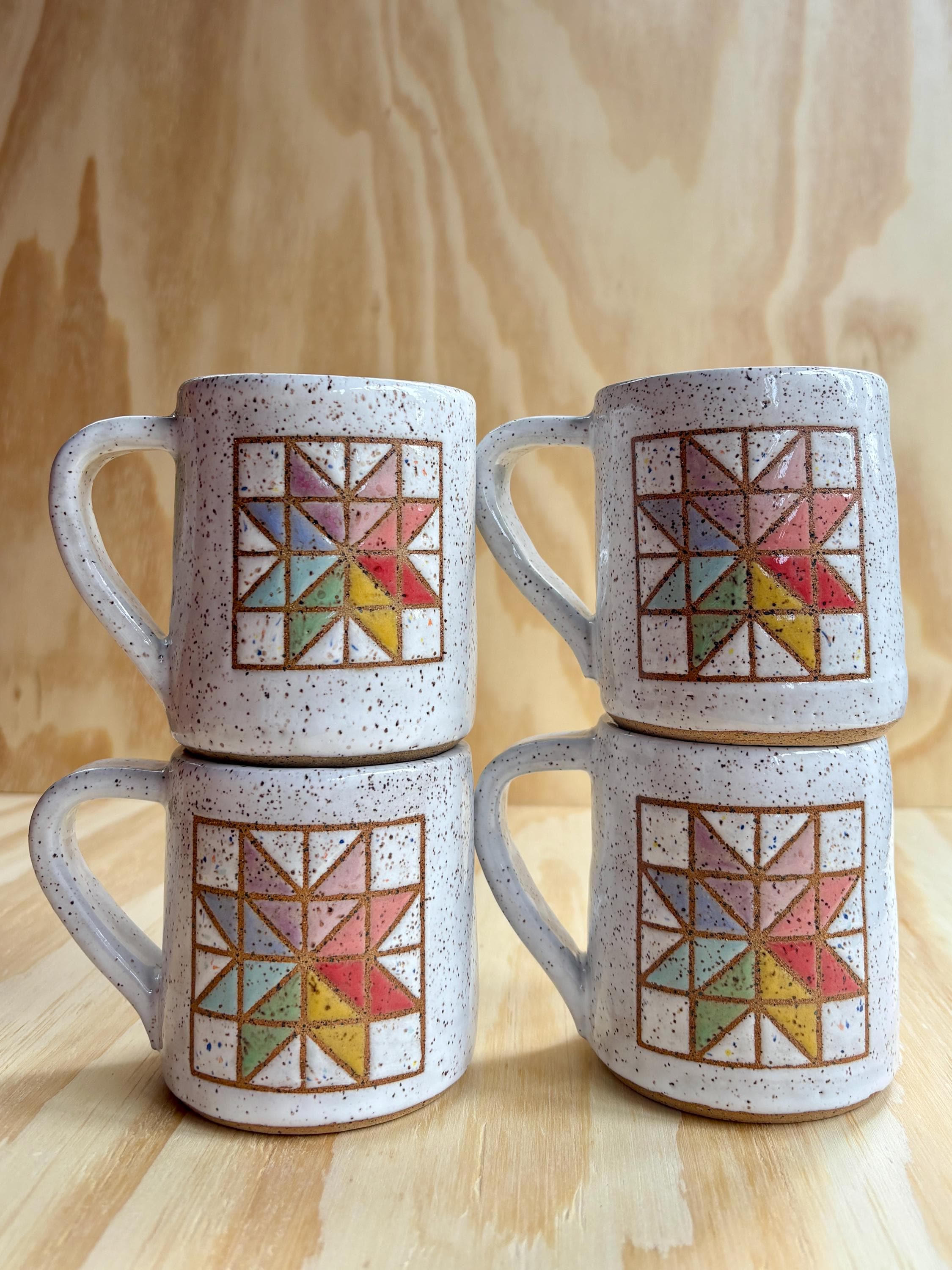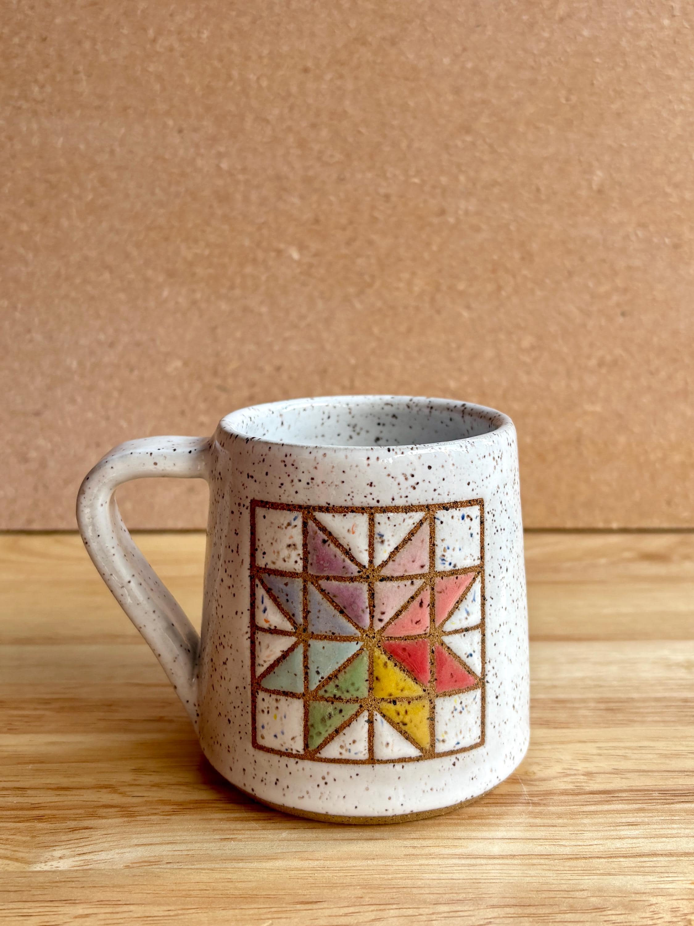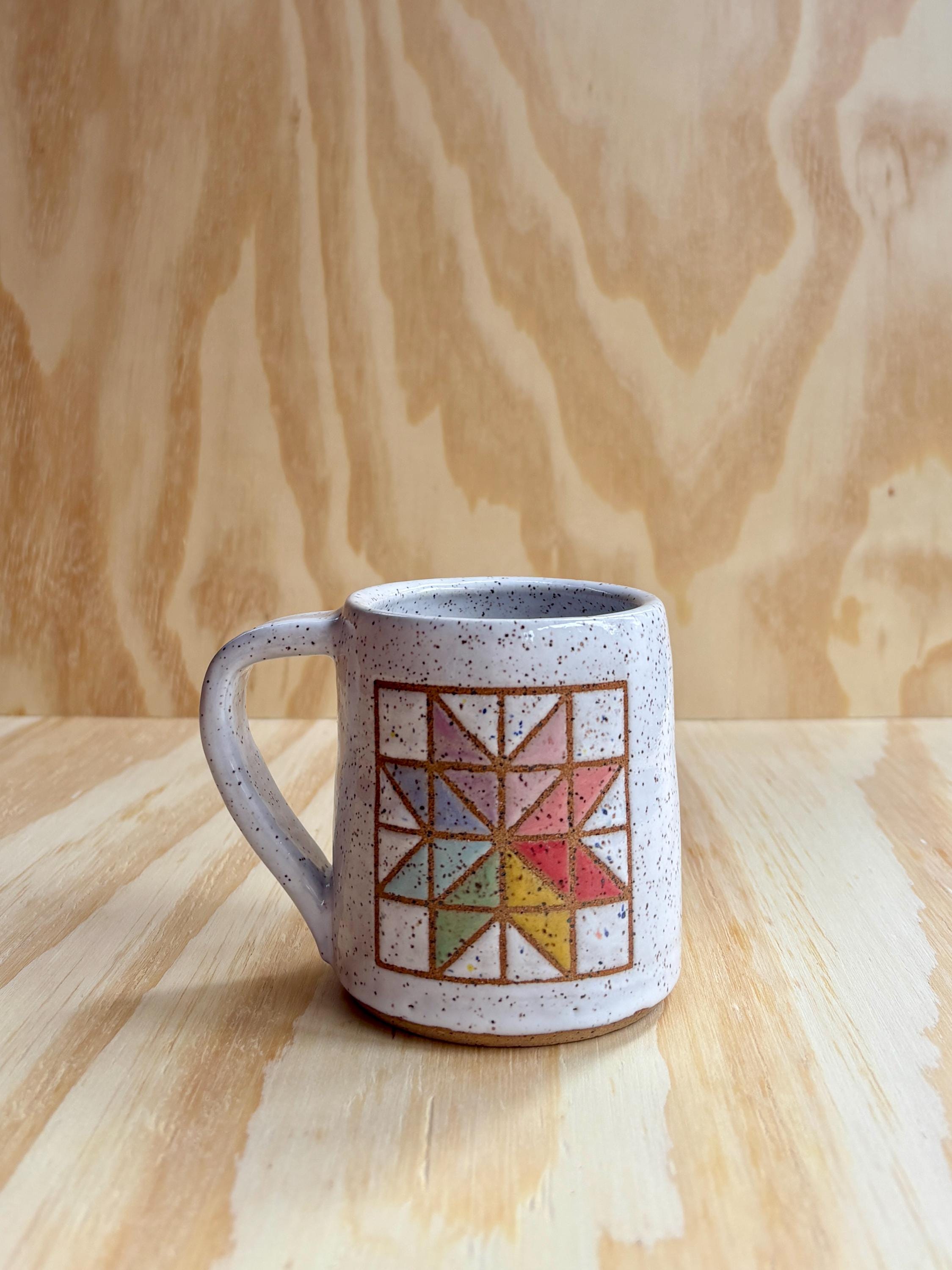 Wheel thrown ceramic mug. Each piece is individually made and decorated by me therefore the piece you receive may not be exact per the photo but will be very similar. The exact mug and handle shaped will vary, but the rainbow quilt design will be the same.