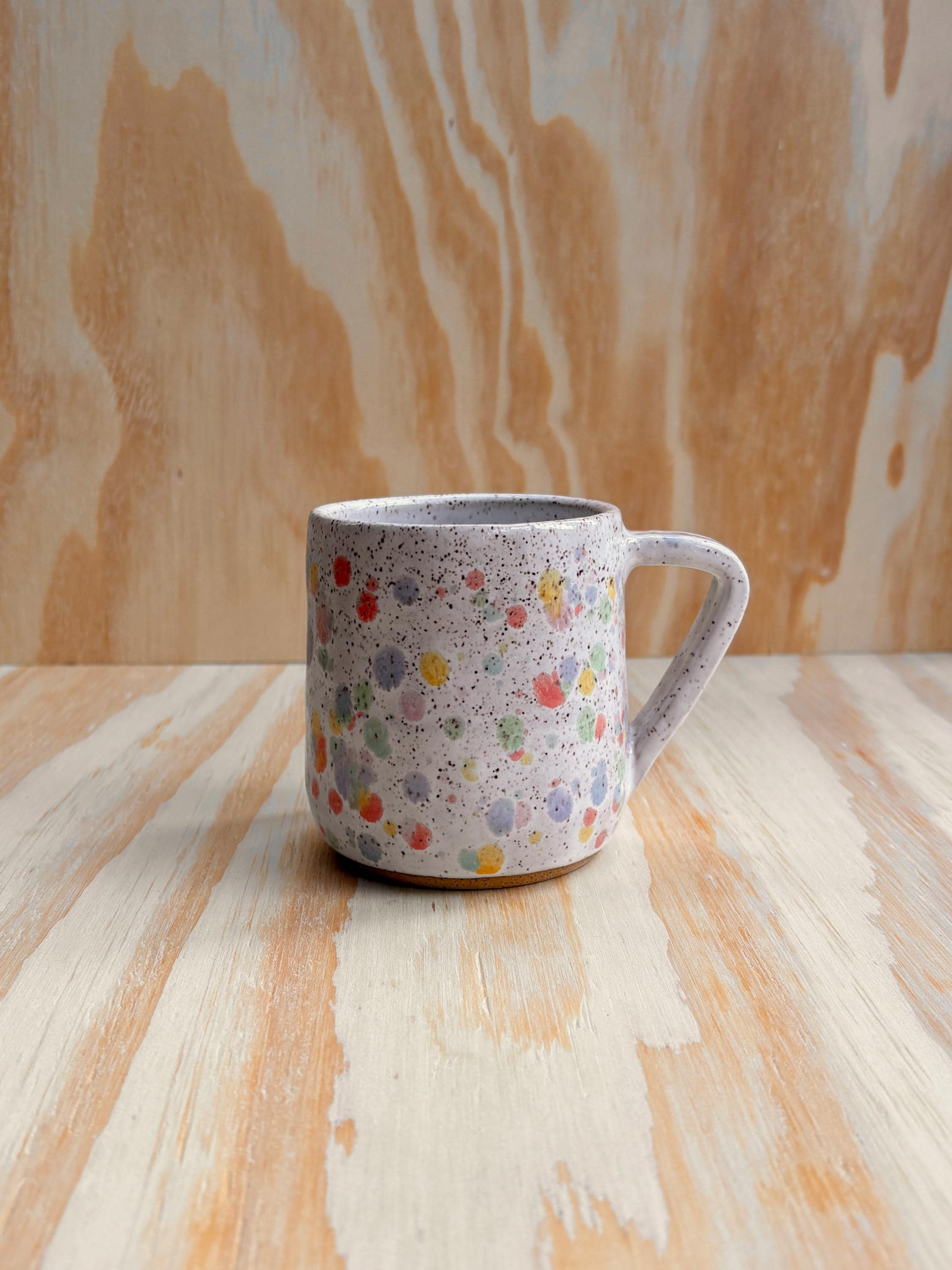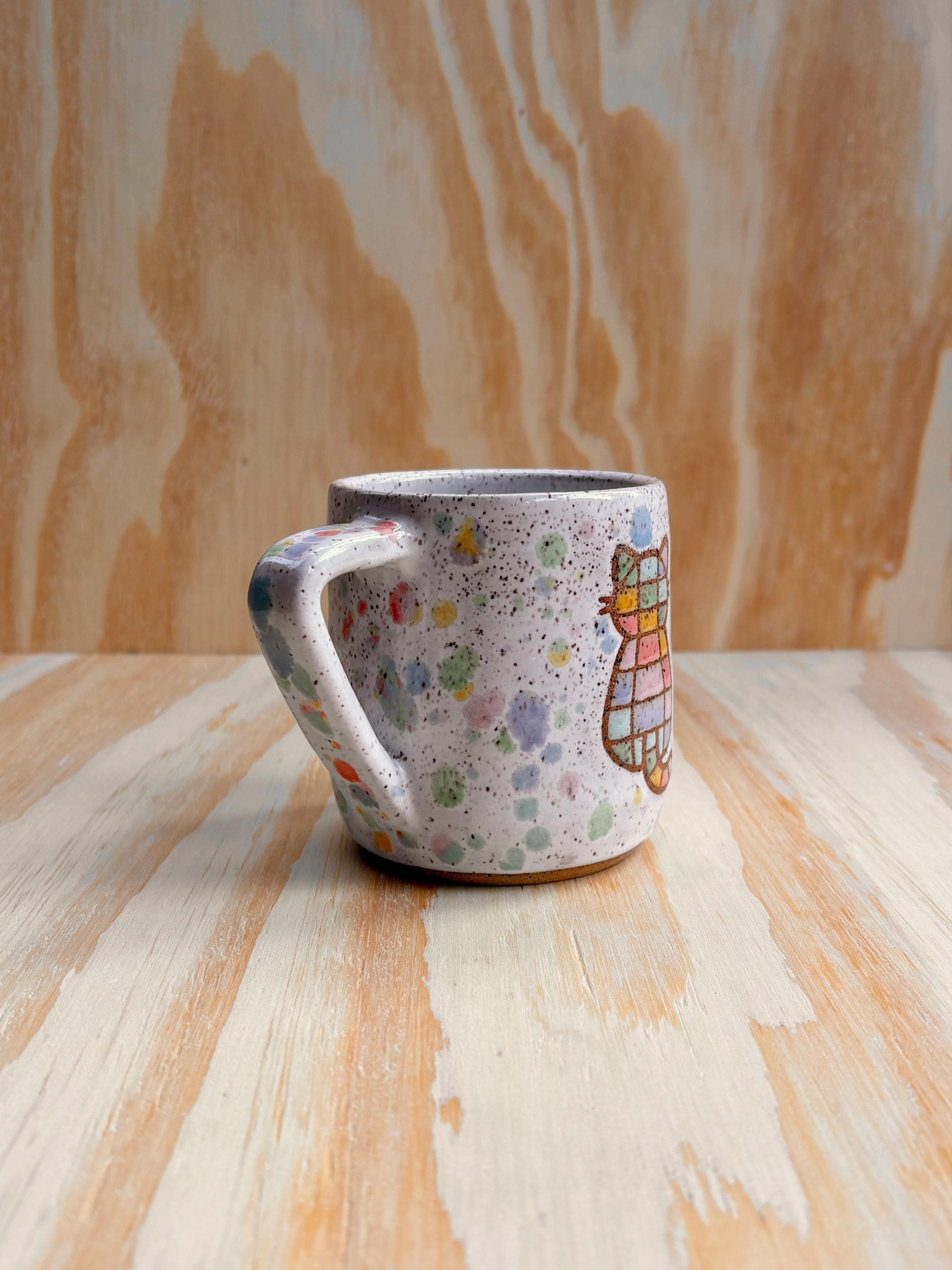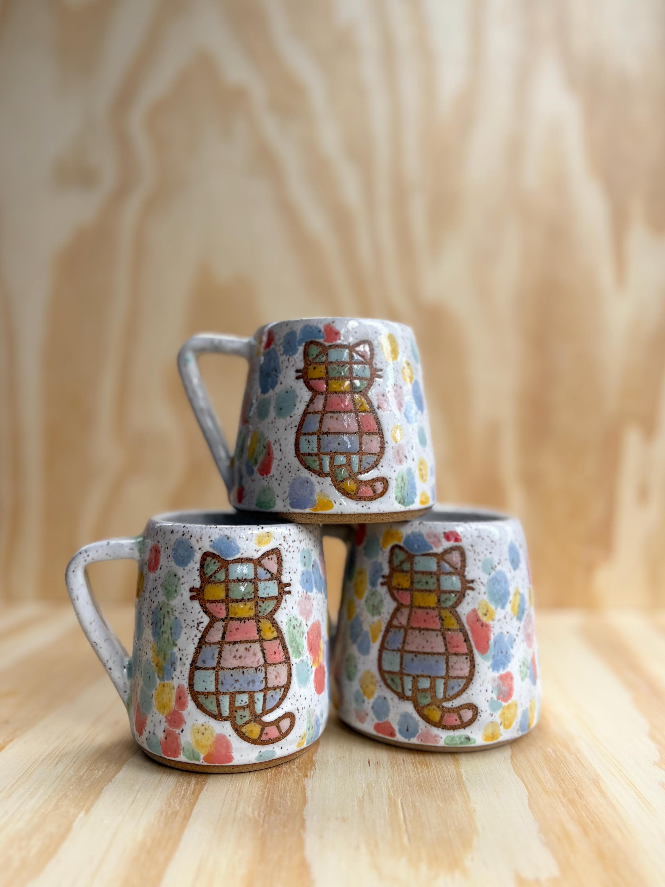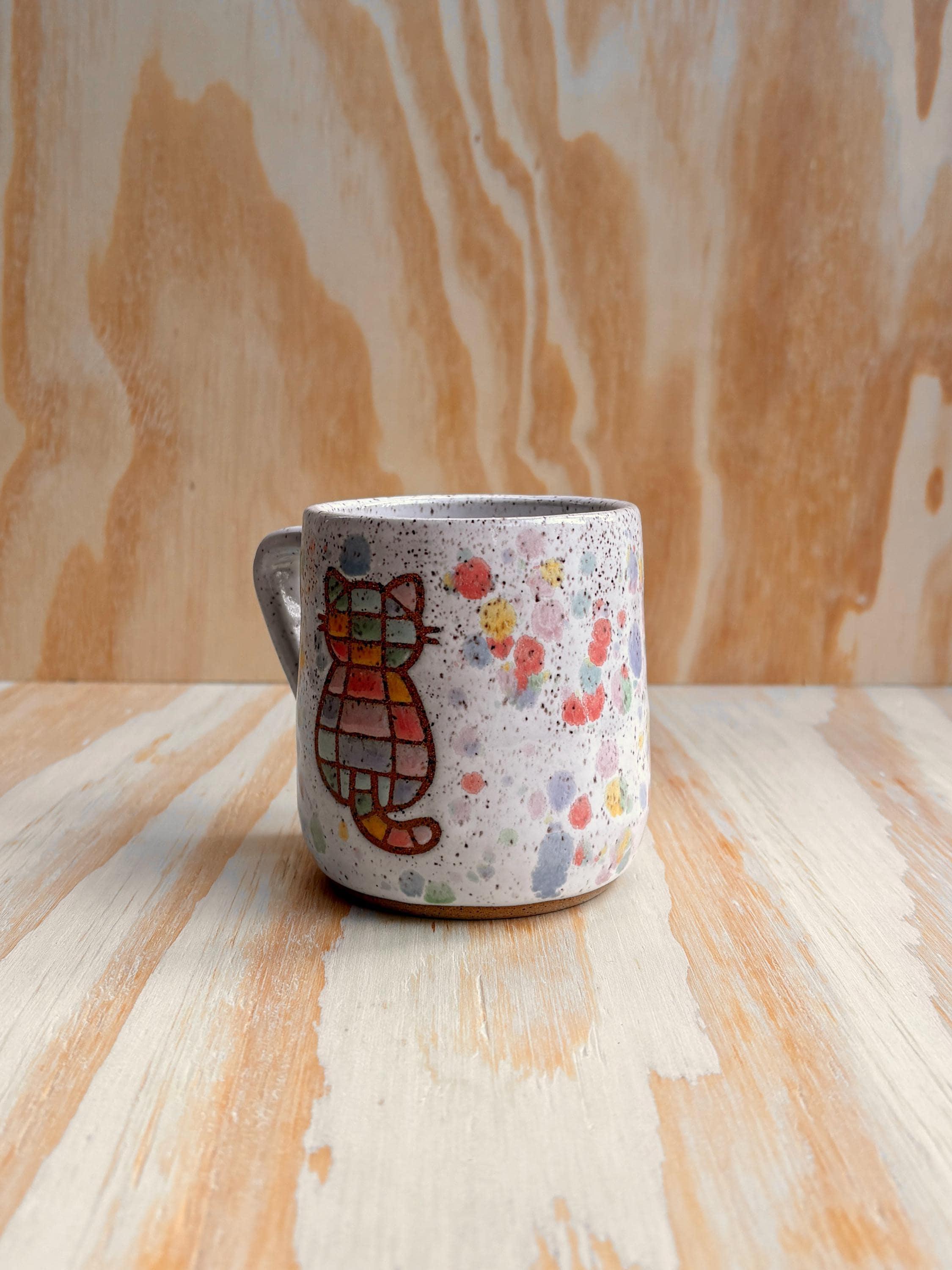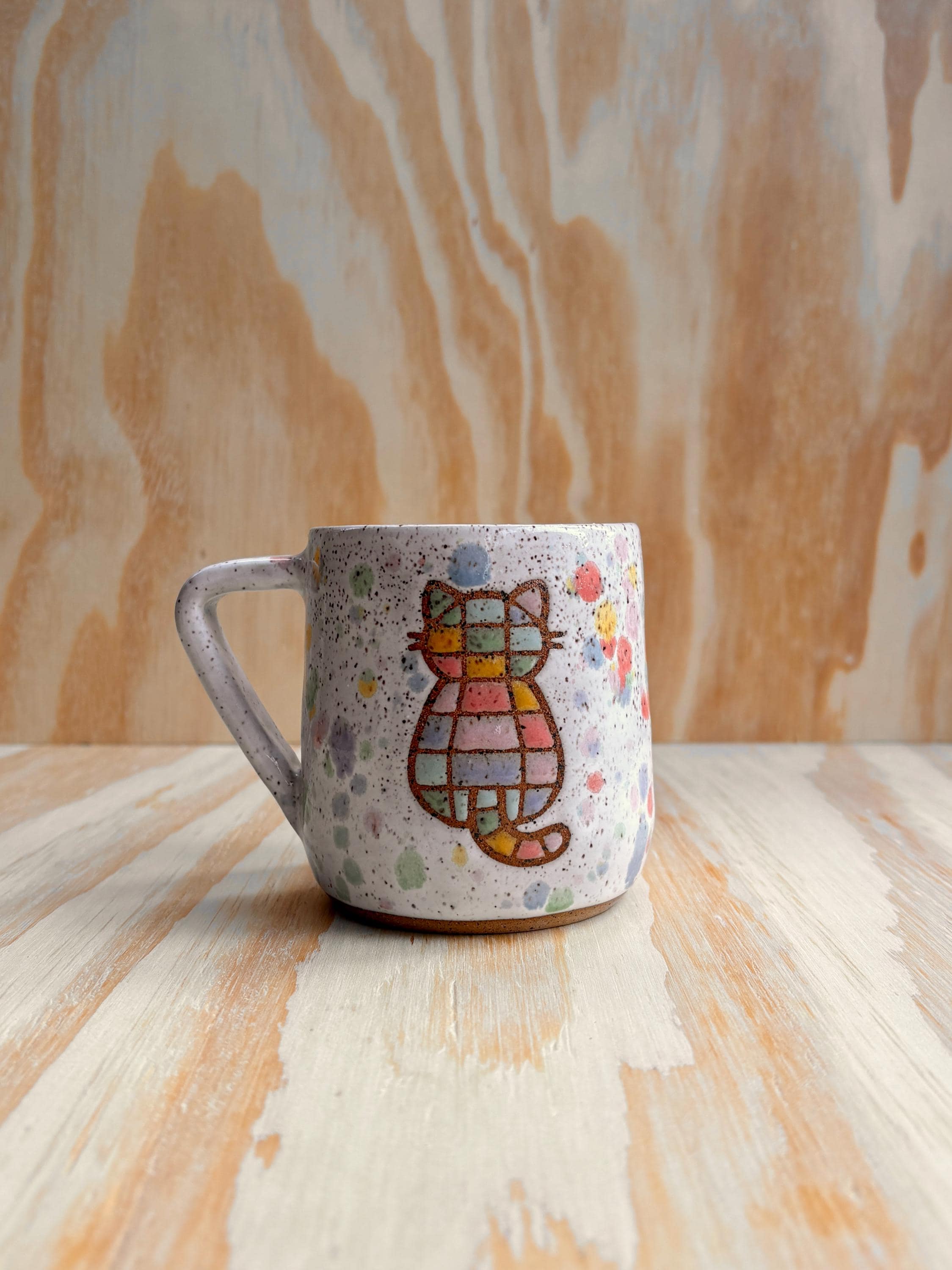 Wheel thrown ceramic mug. Each piece is individually made and decorated by me therefore the piece you receive may not be exact per the photo but will be very similar. The exact mug and handle shaped will vary, but the rainbow kitty design will be the same.